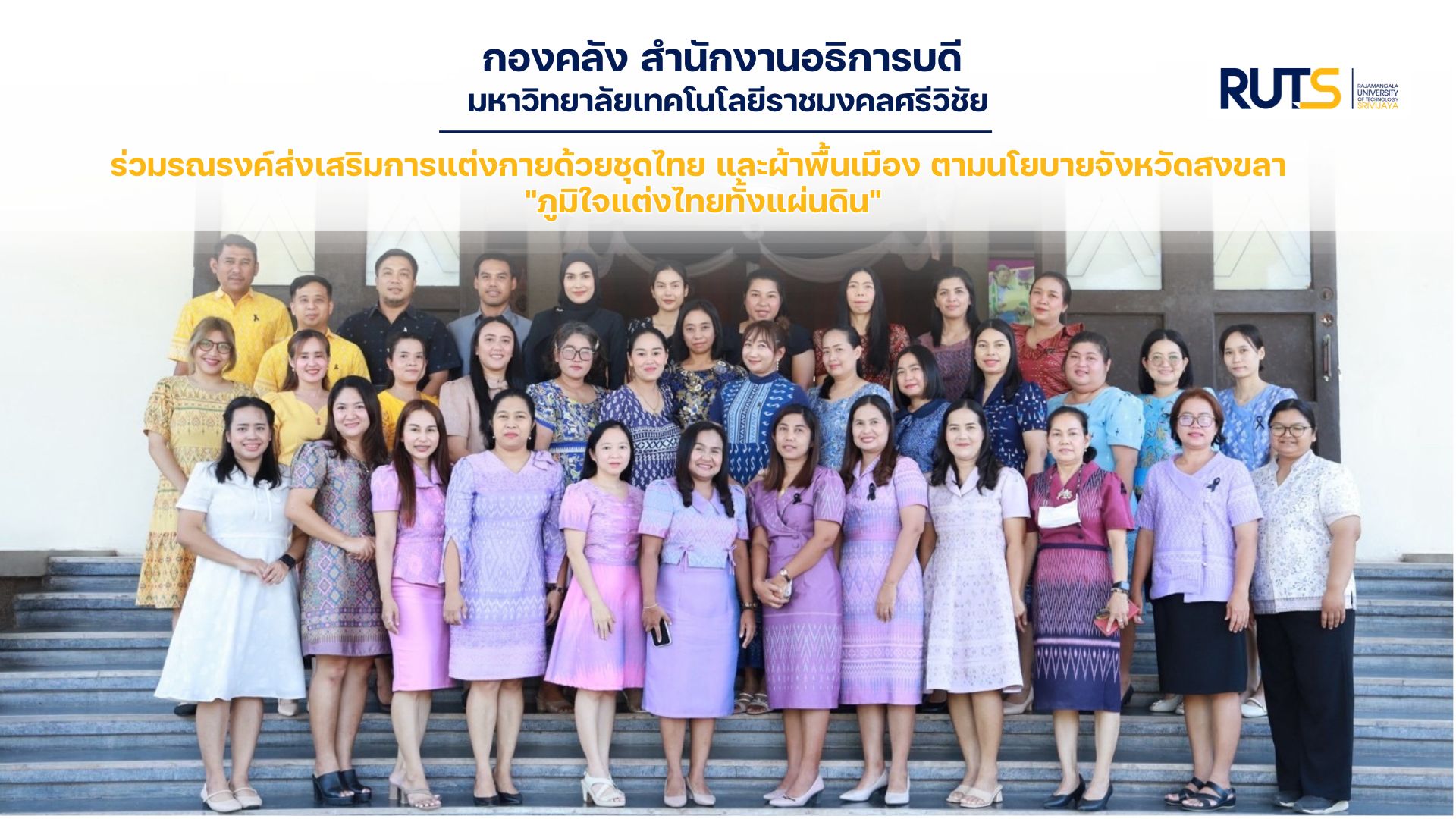 กองคลัง สำนักงานอธิการบดี มทร.ศรีวิชัย ร่วมรณรงค์ส่งเสริมการแต่งกายด้วยชุดไทย และผ้าพื้นเมือง ตามนโยบายจังหวัดสงขลา “ภูมิใจแต่งไทยทั้งแผ่นดิน” ร่วมสืบสาน อัตลักษณ์ผ้าไทย และชุดประจำชาติ ร่วมเป็นส่วนหนึ่งในการอนุรักษ์มรดกทางวัฒนธรรม โดยการสวมใส่ชุดไทยและผ้าพื้นเมืองตามความเหมาะสม เพื่อร่วมผลักดันการขึ้นทะเบียน “ชุดไทย” เป็นมรดกภูมิปัญญาทางวัฒนธรรมที่จับต้องไม่ได้ของมนุษยชาติต่อองค์การ (UNESCO) และร่วมเป็นส่วนหนึ่งในการเทิดพระเกียรติสมเด็จพระนางเจ้าสิริกิติ์ พระบรมราชินีนาถ พระบรมราชชนนีพันปีหลวง แสดงออกถึงความรักในอัตลักษณ์ความเป็นไทยอย่างภาคภูมิใจไปพร้อมกัน